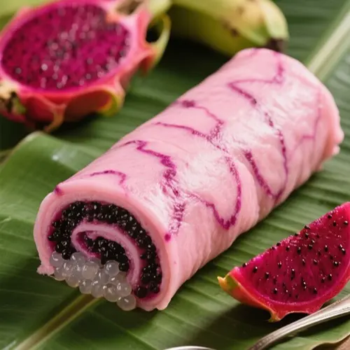 特色甜品「火龍果西米卷」,輕薄卷面包裹著火龍果果泥與 Q 彈西米。入口後清新果香彌漫,每一口都清爽獨特,夏日解暑的好選擇!