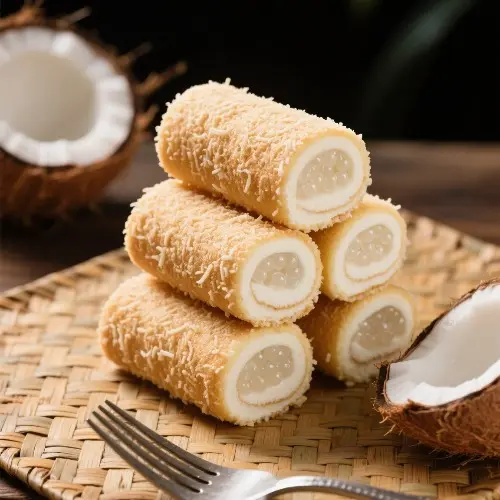 經典甜品「西米椰汁卷」,薄軟面皮包裹著 Q 彈西米與濃郁椰汁。製作後椰香撲鼻,每一口都充滿清甜,清爽又解膩,下午茶或飯後甜品的絕佳選擇!